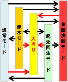 西軍の和了りを回避できれば「東西決戦モード」継続、失敗した場合は確変or時短20回転の「起死回生モード」へ移行する。