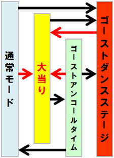 滞在中に「ゴーストアイドル」が3人揃えば、次回大当りまで電サポ継続の確変「ゴーストダンスステージ」へ突入する。
