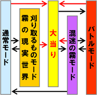 「刈り取るものBONUS」で「刈り取るもの」に敗北した場合、「バトルモード」中のバトルで敗北した場合に突入する、確変or時短10回転のモード。●霧の現実世界/刈り取るものモード