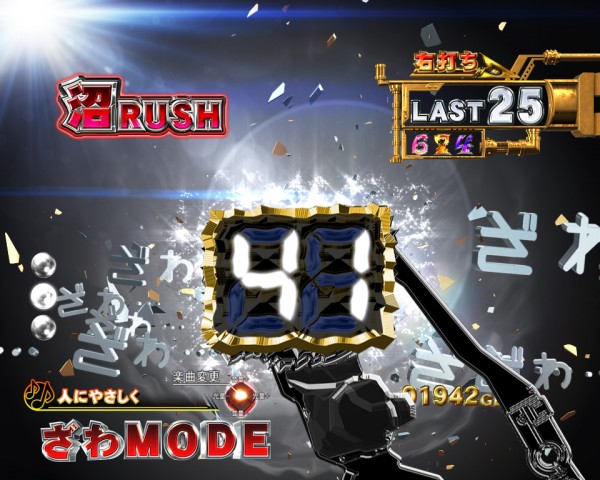 滞在中は専用の演出で展開。基本は、セグ役物に[3]or[7]が2つ並べば大当り濃厚となる「ざわモード」で展開される。