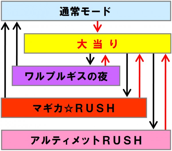 「まどか☆マギカBONUS」後、「アルティメットRUSH」終了後、「ワルプルギスの夜」中の大当り後に突入する、電サポ6回転のモード。●ワルプルギスの夜