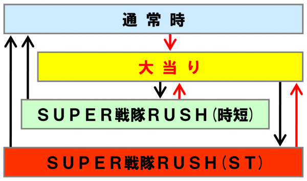 滞在中の大当り後は電サポ付きST120回転のSUPER戦隊RUSH(ST)へ突入する仕様となっている。