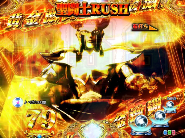 滞在中の大当り後は電サポ付きST80回転の「聖闘士RUSH」へ突入する。また、電サポ中の大当りは18%で約1,140発獲得可能な10R確変大当りとなっている。