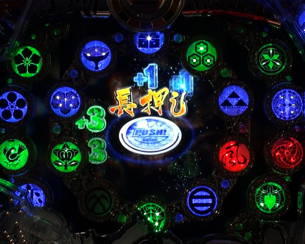 PUSHボタン長押しで家紋を獲得。獲得した家紋の色によって期待度が変化し、最終的に表示される数字が期待度となる。