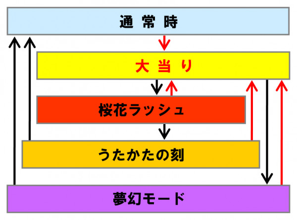 突入した時点で実質次回大当り濃厚となっており、滞在中の大当り後は電サポ付きST100回転の「桜花ラッシュ」へ突入する。
