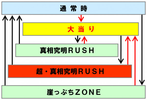 滞在中の大当り後は電サポ120or220回転+αの超・真相究明RUSHへ突入する仕様で、大当り時は全て約1,500発獲得可能な10R確変大当りとなっている。