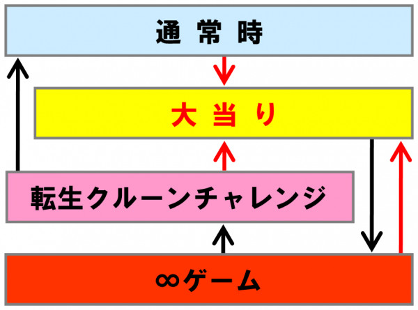 また、[0]図柄が揃った場合は3つ穴クルーンによるガチ抽選の「転生クルーンチャレンジ」へ移行する。