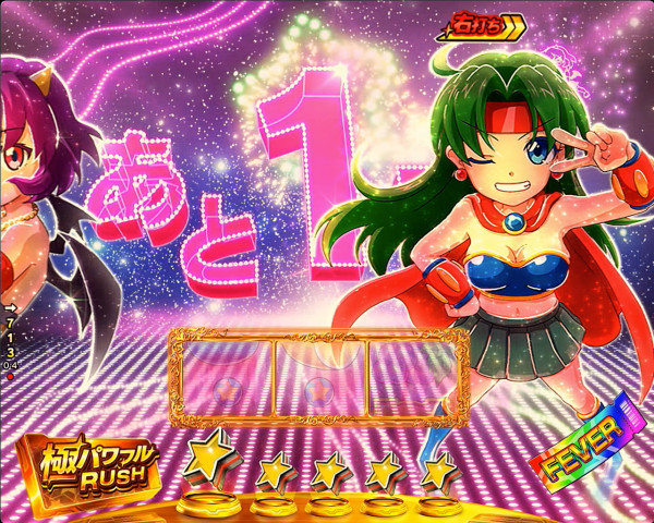 滞在中の継続率は約64.2%。また、大当り時の約10%は1,000発獲得可能な10R確変大当りで、ラウンド終了後は2回以上の大当りを獲得できる極パワフルRUSHへ突入する。