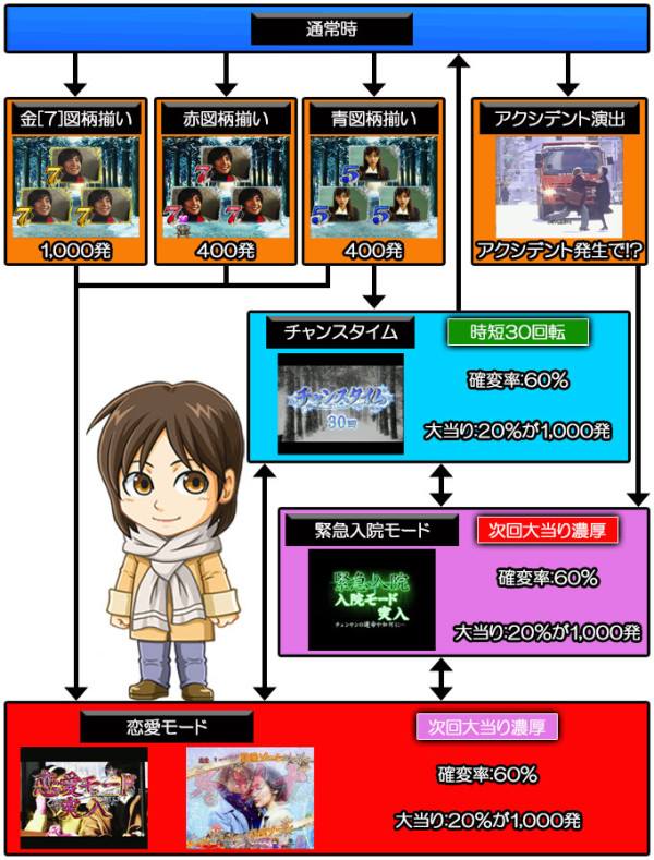 演出面では、図柄揃い後にチュンサンが目を覚ませば次回大当りまで電サポが継続する確変の恋愛モードへ突入!?
