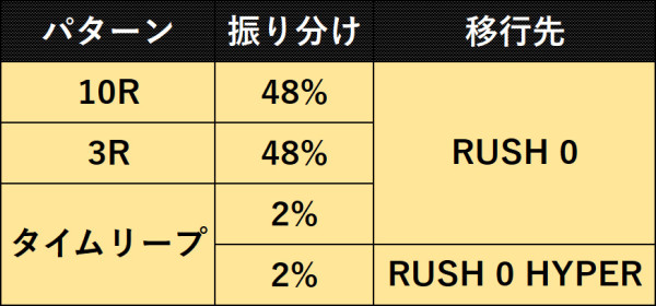 成功すればタイムリープが発生し、電サポ回数を巻き戻す。また、「RUSH 0」中なら「RUSH 0 HYPER」突入に期待。