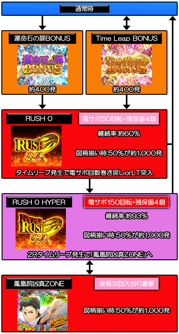 なお、タイムリープ発生時の50%でラッキートリガー(LT)が発動し、電サポ150回転+残保留4個の「RUSH 0 HYPER」へ突入する。
