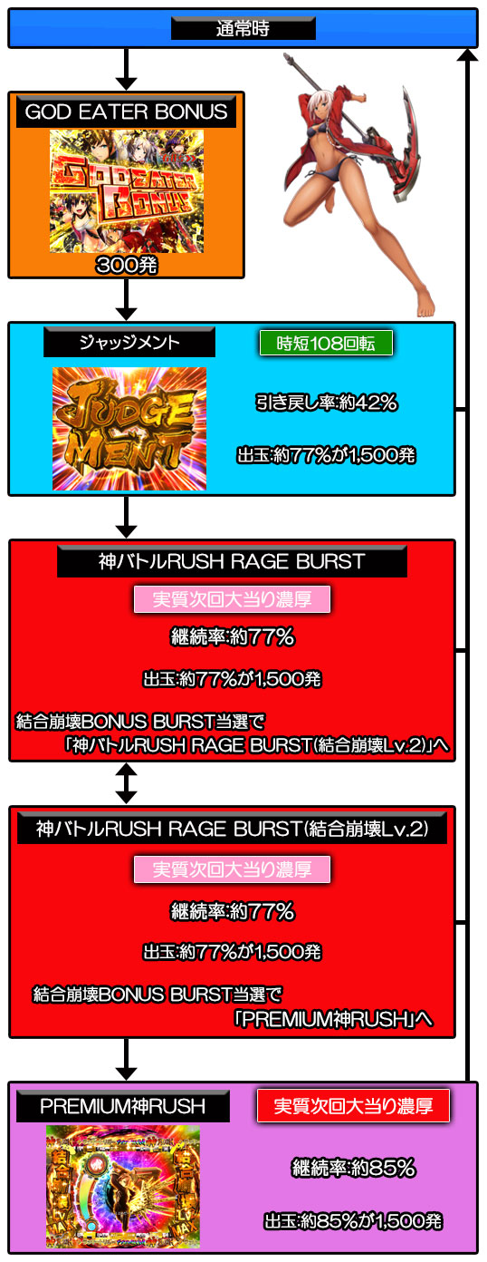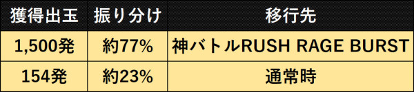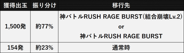 滞在中の大当り時は約77%の確率で突破成功となり、1,500発獲得可能な10R大当り+実質次回大当り濃厚の「神バトルRUSH RAGE BURST」へ突入。引き戻し期待度は約42%。