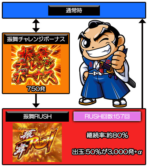 滞在中の大当り後は再び振舞RUSHへ突入する仕様で、継続率は約80%。また、大当り時は50%が3,000発+α獲得可能となっている。