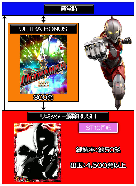 滞在中の大当り後は再びリミッター解除RUSHへ突入する仕様で、継続率は約50%。また、大当りは全て4,500発以上獲得可能で、9,000発獲得可能な振り分けも搭載している。
