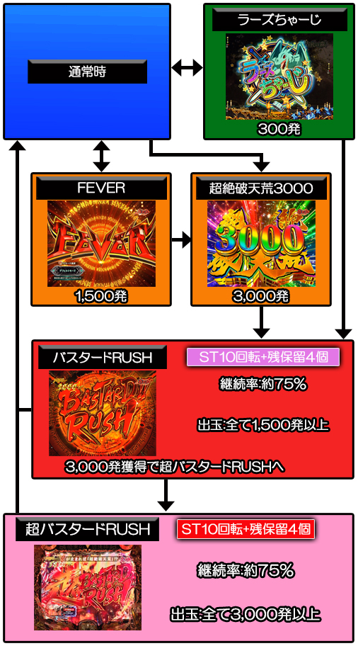 超絶破天荒3000後、ラーズちゃーじでラーズがバスタードRUSHのロゴを口にくわえた場合に突入する、ST10回転+残保留4個のモード。