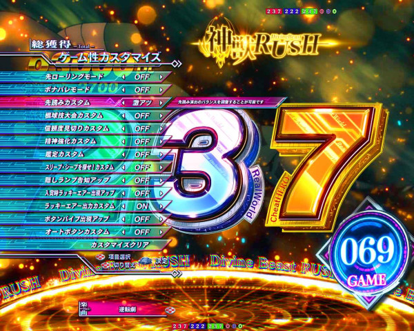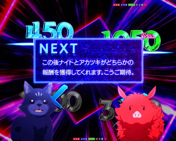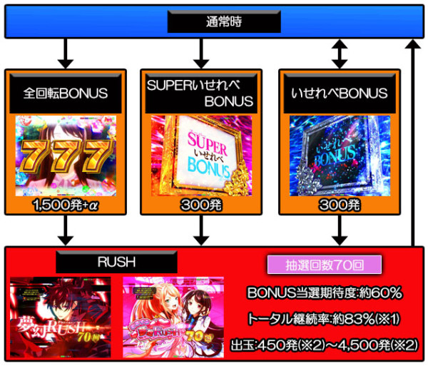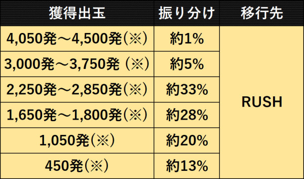 滞在中のBONUS後は再びRUSHへ突入する仕様で、BONUS当選期待度は約60%。また、BONUS時は全て450発(※)~4,500発(※)獲得可能となっている。