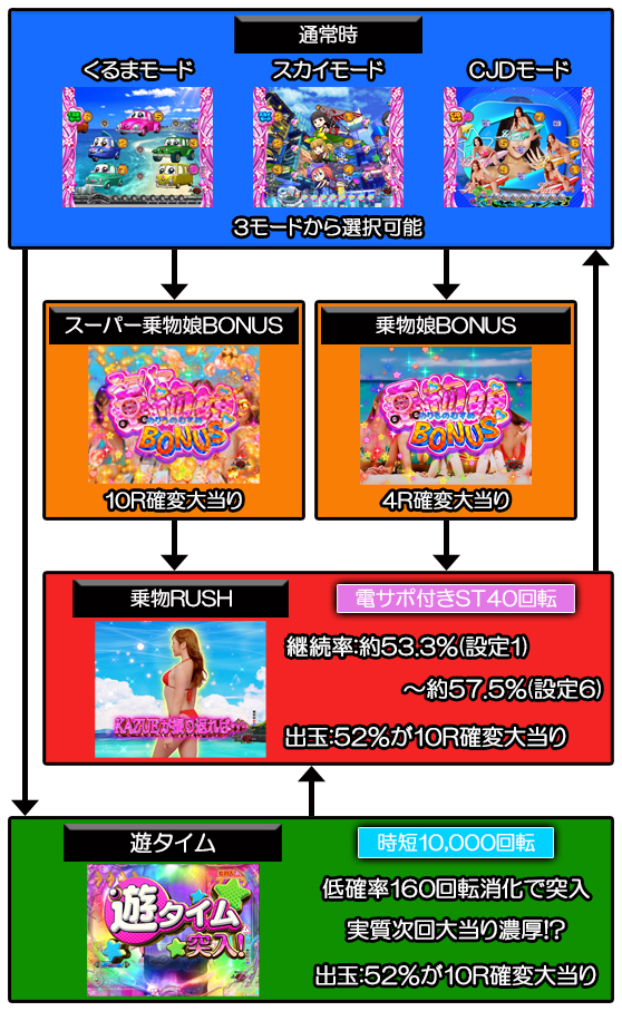 滞在中の大当り後は再び乗物RUSHへ突入する仕様で、継続率は約53.3%(設定1)~約57.5%(設定6)。また、大当り時は52%が10R確変大当りとなっている。