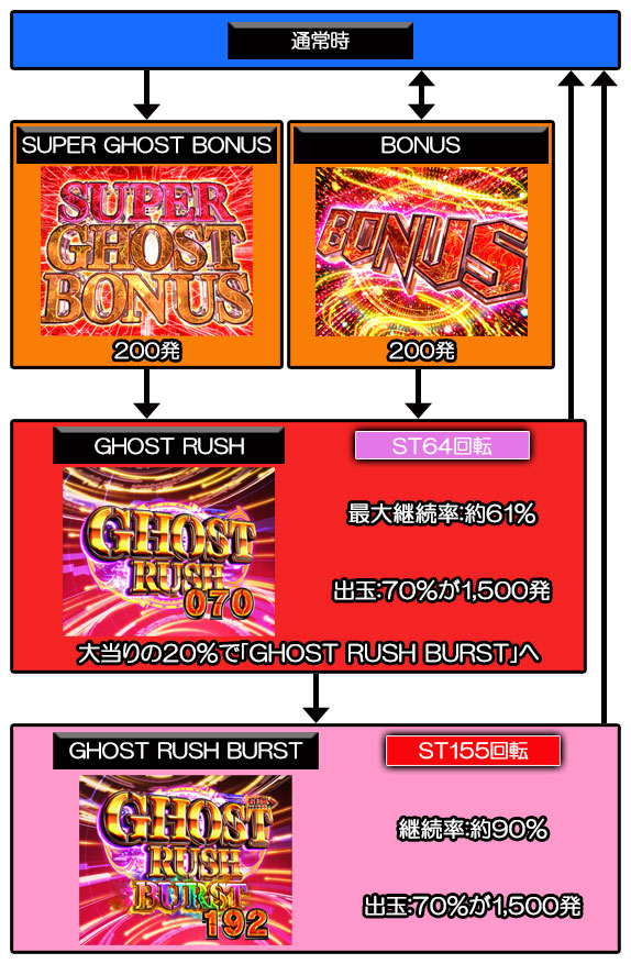 基本的に大当り後は再び「GHOST RUSH」へ突入。突入時の継続率は約50%で、1連後の継続率は約61%。また、大当り時は70%が1,500発獲得可能な10R大当りとなっている。