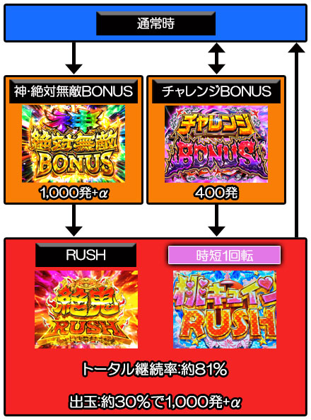 滞在中の大当り後は再びRUSHへ突入する仕様で、継続率は約74%。また、大当り時は約30%が1,000発+α獲得可能な神・絶対無敵BONUSのためトータル継続率は約81%。
