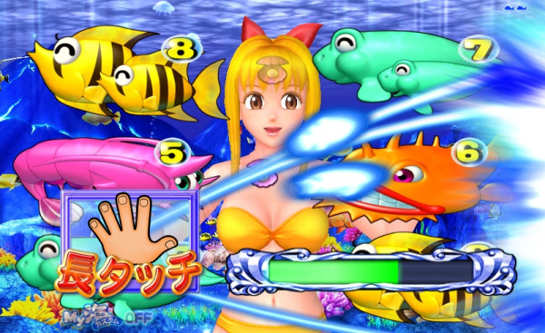 画面にタッチするとマリンちゃんが手を振り、左手で振るとチャンス。さらに、両手でピースを作り手を振ると確変大当り濃厚。