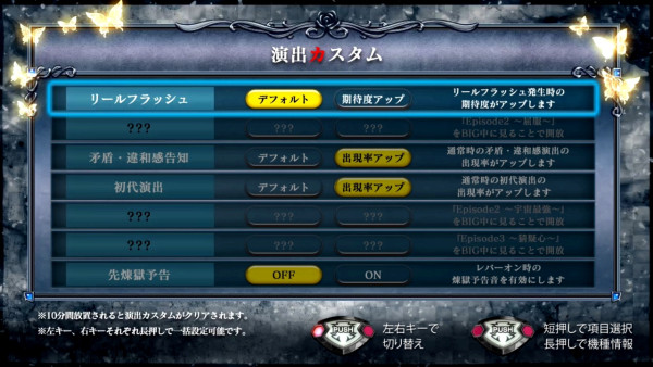 特定条件を達成するとメニュー画面から演出カスタムが可能となり、自分好みの演出バランスを楽しめる。