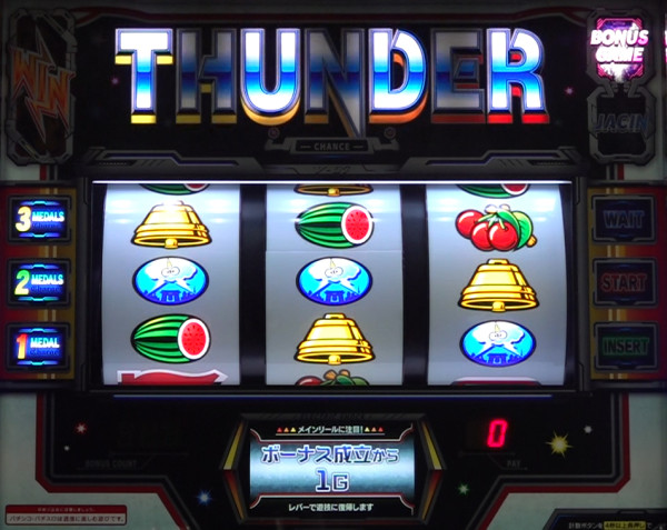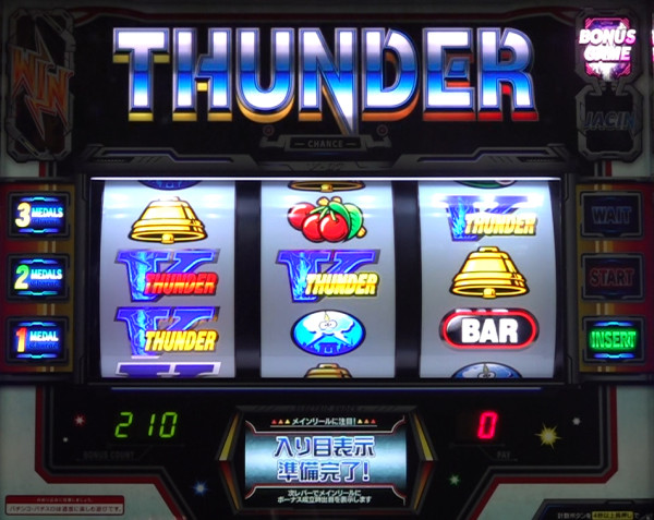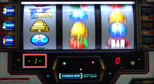 準備完了後にレバーを叩くと、メインリールにボーナス成立時の出目が停止し、液晶にボーナス成立後経過ゲーム数が表示される。
