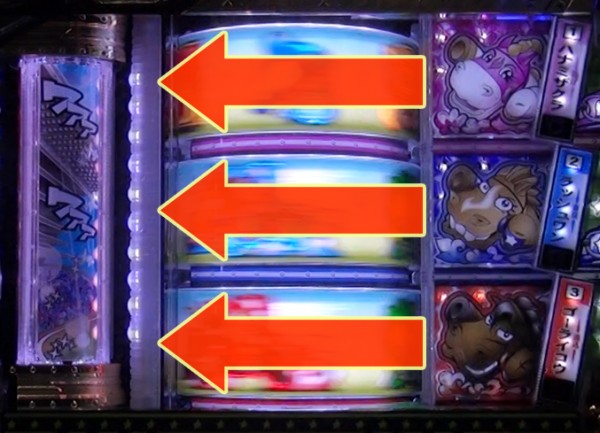 変動開始時にリールがガタガタ動き、その後一斉に回転する。