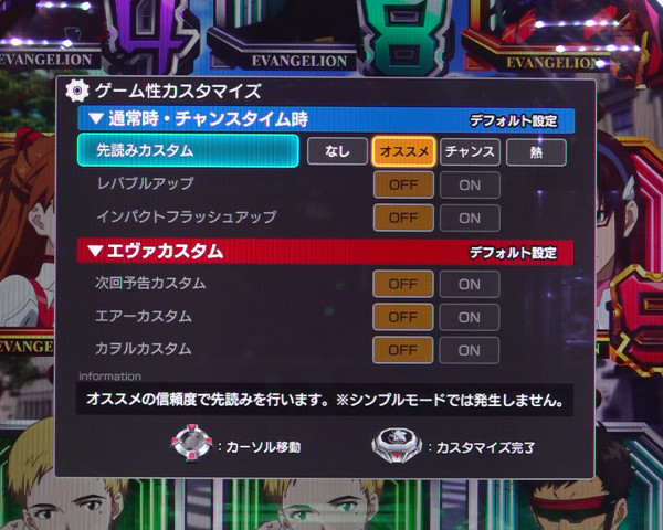 「なし」「オススメ」「チャンス」「熱」の4種類から選択可能で、「チャンス」「熱」設定時は先読み演出の期待度がアップ。
