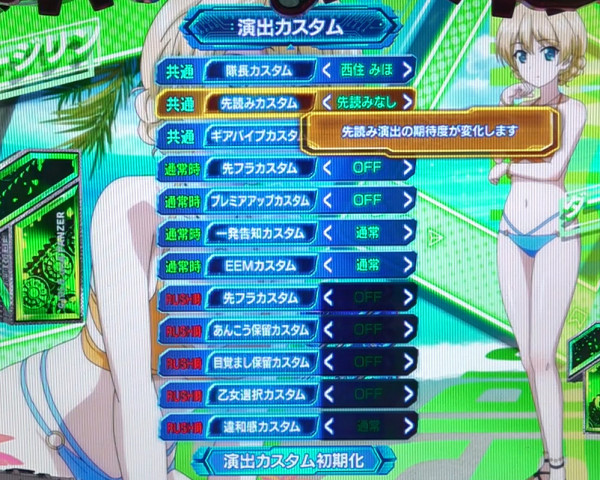 「通常」「UP」「超UP」「先読みなし」から選択可能。選択したカスタムによって先読み演出の期待度が変化する。