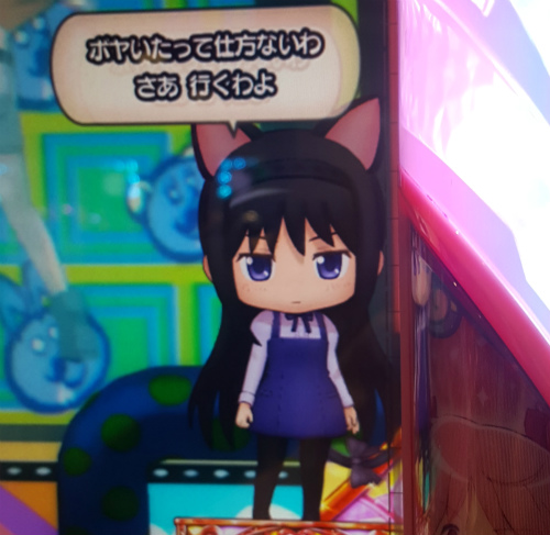 今日は、ほむらちゃんでコスチューム[ほむら 私服]&アクセサリー[猫耳]をチョイス。いつもローテーションなので本来なら杏子ちゃんなのだが、最後は狙うべきNo.69【ほむらプレミア】大好きな思い出の対象キャラで勝負!ただ、ファーストタッチのセリフがこれとは、痛いところを突いてくるな(汗