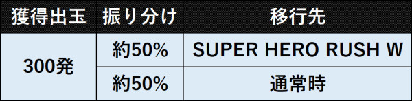 奇数図柄揃いから突入する300発獲得可能な2R大当りで、ラウンド終了後はST153回転の「SUPER HERO RUSH W」へ突入する。
