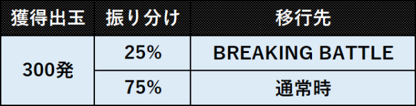 [7]図柄揃いから突入する300発獲得可能な2R大当りで、ラウンド終了後はバトル最大3回まで継続する「BREAKING BATTLE」へ突入する。