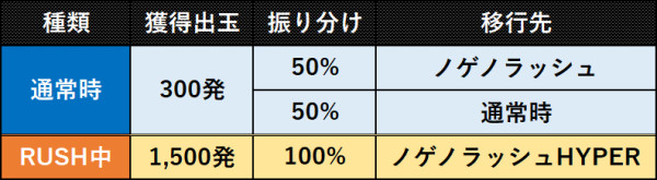 300発獲得可能な大当りで、ラウンド終了後は電サポ10回転+残保留4個のノゲノラッシュへ突入する。・BONUS