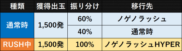 スペックは、大当り確率1/319.6、ノゲノラッシュ突入率60%のミドルタイプ。