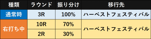 通常時の図柄揃い時は300発獲得可能な3R確変大当りとなり、ラウンド終了後は電サポ72回転(ST)のハーベストフェスティバルへ突入する。