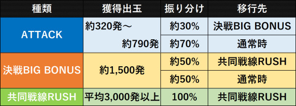 約1,500発獲得可能な10R大当りで、演出に成功すれば図柄揃いor終了確率当選まで継続の共同戦線RUSHへ突入する。●大当りの振り分け