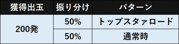 200発獲得可能な2R大当りで、キリンが登場すればST45回転+残保留4個のトップスタァロードへ突入、キリンが登場しなかった場合は通常時へ移行する。●大当りの振り分け(通常時・特図1)