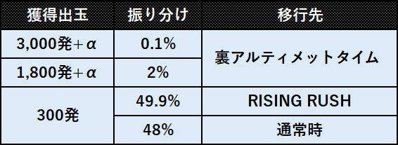 300発獲得可能な2R大当りで、RISINGチャレンジに成功した場合は次回大当りor転落小当り当選まで継続の「RISING RUSH」へ、失敗した場合は通常時へ移行する。●大当りの振り分け(通常時)