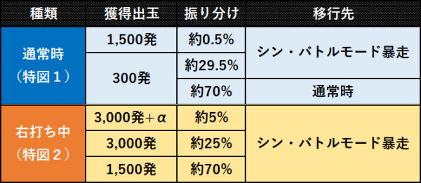 「シン・バトルモード暴走」は「継続率 約80%」「図柄揃い時は全て1,500発以上獲得可能」に加えて、上乗せループ状態のG覚醒モードを搭載している。