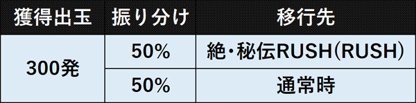 消化中の演出に成功すれば「絶・秘伝RUSH(RUSH)」へ、失敗した場合は通常時へ移行する。●大当りの振り分け【通常時・特図1】