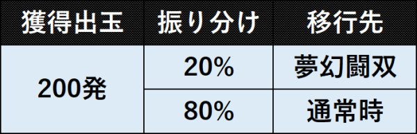 200発獲得可能な2R大当りで、ラウンド終了後に夢幻闘双チャレンジが発生し、成功すれば「夢幻闘双」へ突入。成功期待度は20%。