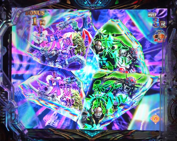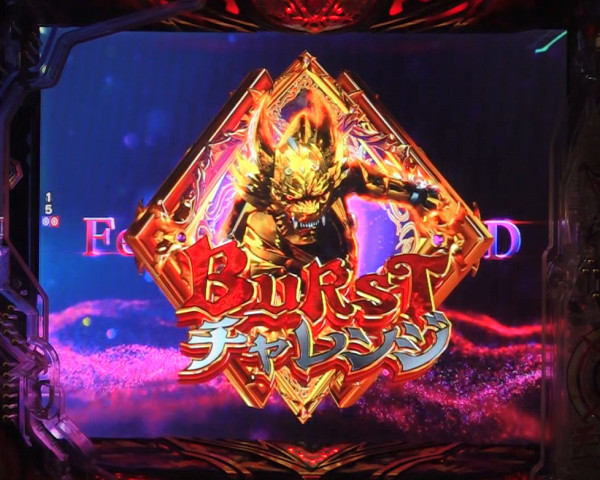 通常時は特殊図柄停止で750発獲得可能な5R大当りとなり、ラウンド中に魔戒BURSTチャレンジが発生。<魔戒BURSTチャレンジ>