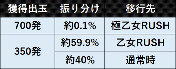 [金七]以外の図柄揃いから突入する350発獲得可能な5R大当り。乙女アタックで勝利すればST70回転の乙女RUSHへ、敗北した場合は通常時へ移行する。●大当りの振り分け(通常時・特図1)