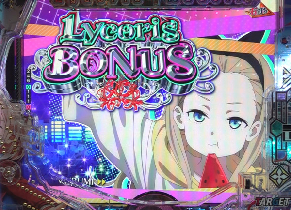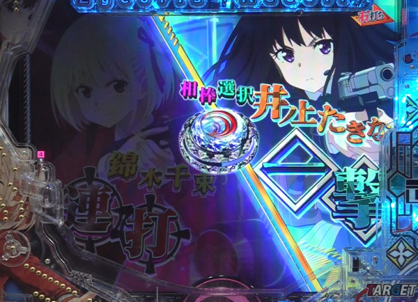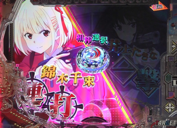 錦木千束(連打)と井ノ上たきな(一撃)から選択可能で、成功すればSPECIAL LycoReco RUSH HYPER DELUXEへ突入。なお、失敗した場合は通常時へ移行する。=錦木千束(連打)=
