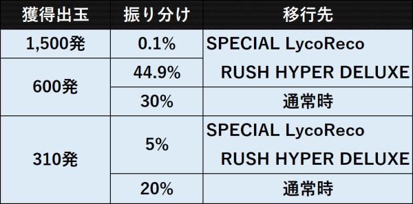 310発獲得可能な3R大当りで、チンアナゴが光ればSPECIAL LycoReco RUSH HYPER DELUXEに突入。なお、光らなかった場合は通常時へ移行する。●大当りの振り分け(通常時・特図1)