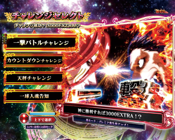 4種類のチャレンジから選択可能。また、レバーを引くと裏モードに移行する。=一撃バトルチャレンジ=