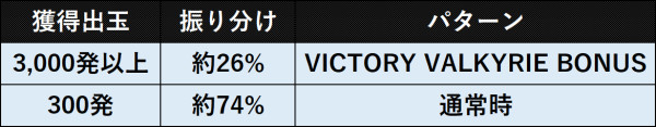 本機は、RUSH中の3戦目勝利で必ず3,000発+約50%で上乗せがループするラッキートリガー「VICTORY VALKYRIE BONUS」に突入する神殺システムが特徴。