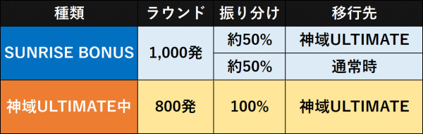 1,000発獲得可能で、演出に成功すれば図柄揃いor転落当選まで継続の神域ULTIMATEへ突入。なお、SUNRISE BONUSは基本的に降臨ガチャを経由して突入するが、直撃するパターンも存在する。