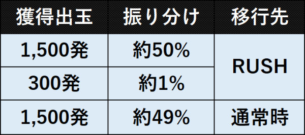 300発獲得可能な2R大当りで、大半は終了後に通常時へ移行するが、ブラックアウトが発生すればRUSHへ突入!?●図柄揃い時の振り分け(通常時・特図1)