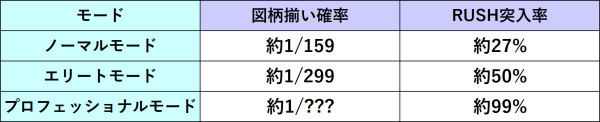 それぞれ「図柄揃い確率」「HAZARD RUSH EXPLOSION突入率」が変化する3スペックを任意に選択可能となっている。※「HAZARD RUSH EXPLOSION」の性能は全モード共通
